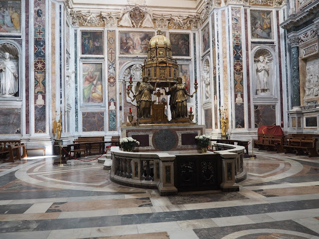 První dominantou, s kterou jsme se seznámily, byla bazilika Panny Marie Sněžné, která byla pár kroků od našeho hotelu. Shodou okolností jde o nejvýznamnější kostel v Římě. Kromě toho, že je bazilika opravdu překrásná, tak ukrývá domnělé pozůstatky betlémských jeslí, takže pokud je to pravda, tak na vlastní oči uvidíte Ježíškovi jesličky :-) No a proč ten název - Sněžné? Podle legendy prý byla bazilika postavena na místě, kde v srpnu nasněžilo.